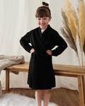 Knee length, kimono style lightweight robe, Single jersey fabric, Self fabric belt loop, Fixed waist tie, Elasticated back, Low flammability to BS 5722, Keep away from fire