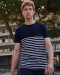 Tag free regular fit heavyweight short sleeved t-shirt, Crew neck with stretch ribbed neckline, Twin needle stitching detail at nck, Flatlock stithcing at neck, shoulder, seams and armholes, High chest seam, Striped lower body, contrast plain upper body and sleeves